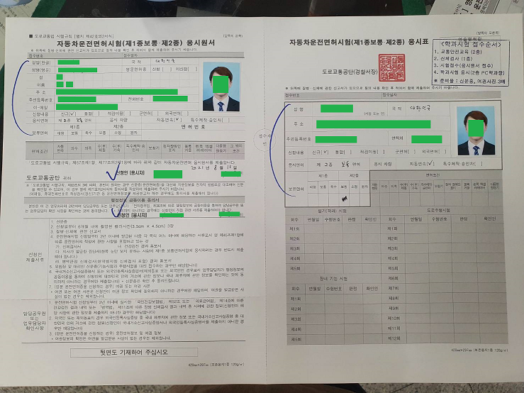 비치되어있는 자동차운전면허시험 응시원서와 자동차운전면허시험 응시표를 뒷면까지 기재합니다.